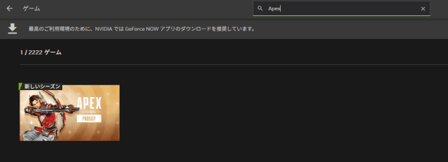 GeForce Nowアカウントにログインした後、検索機能を使って『Apex』と入力して検索します。