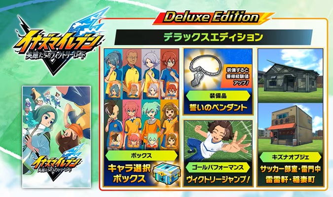 イナズマイレブン 英雄たちのヴィクトリーロードのデラックスエディションには、主に見た目に関する要素と、序盤から少し有利に進められるアイテムやキャラクターが付属します。