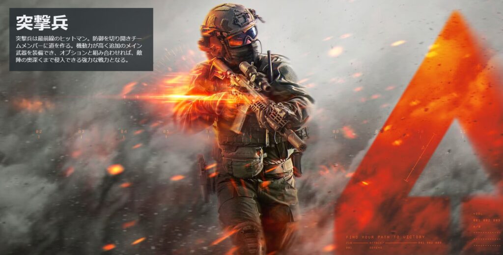 優れた機動性を武器に敵の陣地へ積極的に突入を図る、攻撃的なプレイスタイルを好むプレイヤー向けの兵科です。