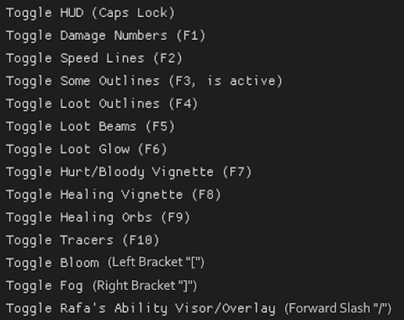 Toggle HUD – Outlines – Dmg Numbers – Bloody Screen – Tracers – Fog – Etc.