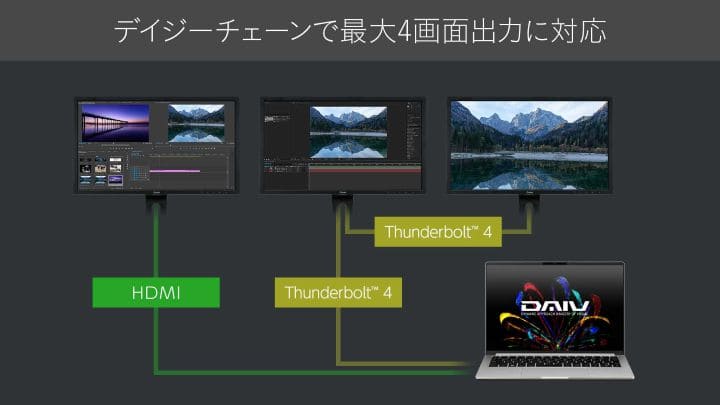 特に、Thunderbolt4はHDMIよりもデータ転送速度が速いため、ノートパソコンの映像をディスプレイにより滑らかに映し出すことができます。