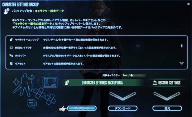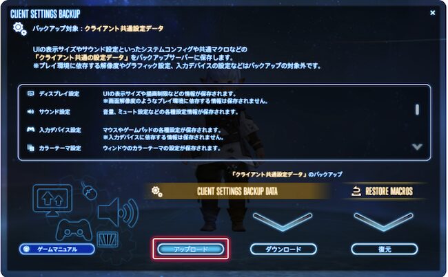 この操作は、ゲーム内の歯車アイコンを選択し、「CLIENT SETTINGS BACKUP」メニューから実行できます。