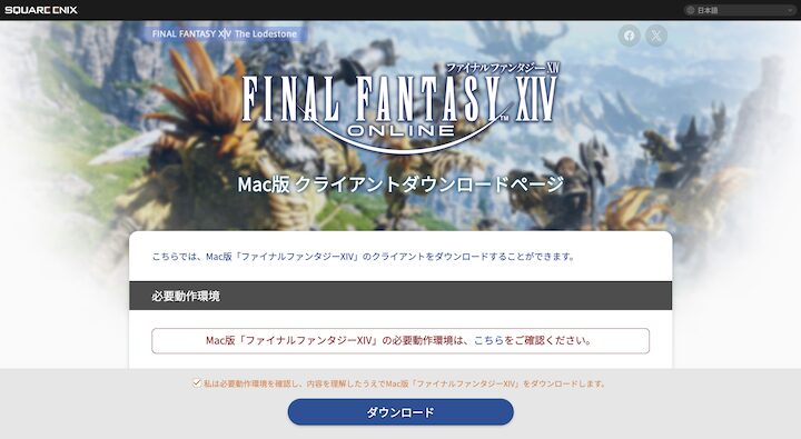 最初に、Mac版『FF14』のダウンロードページへアクセスし、ゲームクライアントを取得します。