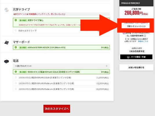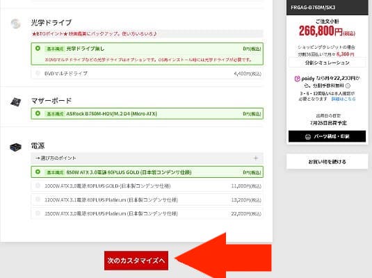 カスタマイズによって価格が変動するので、ページ下部の合計金額を確認し、予算内に収まっているか確認しましょう。