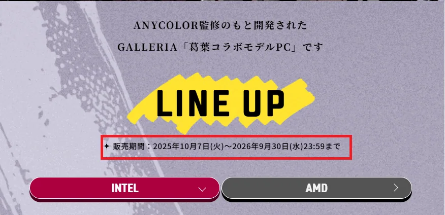 葛葉コラボPCは、公式サイトの情報によると2025年10月7日(火)から2026年9月30日(水)の23時59分まで販売される予定となっています。