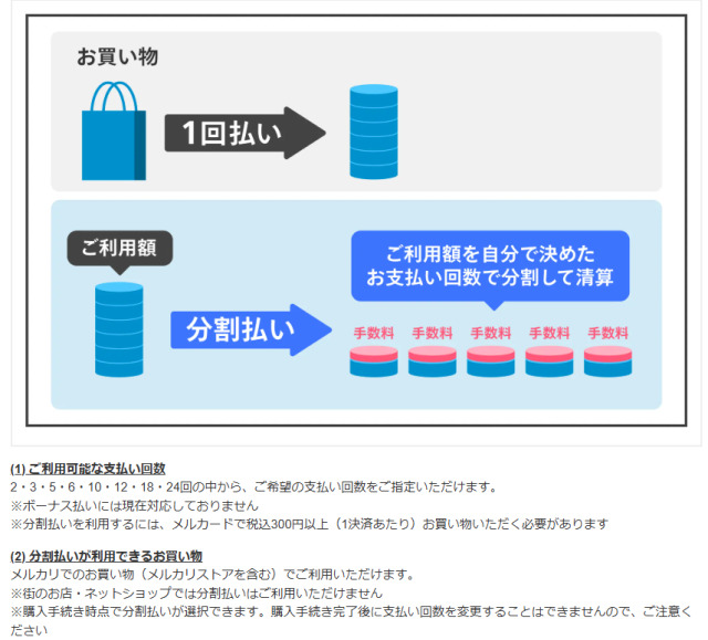 ただし、分割払いを利用するにはメルカリのクレジットサービス「メルカード」の発行が必要ですので、事前に登録しておくと良いでしょう。
