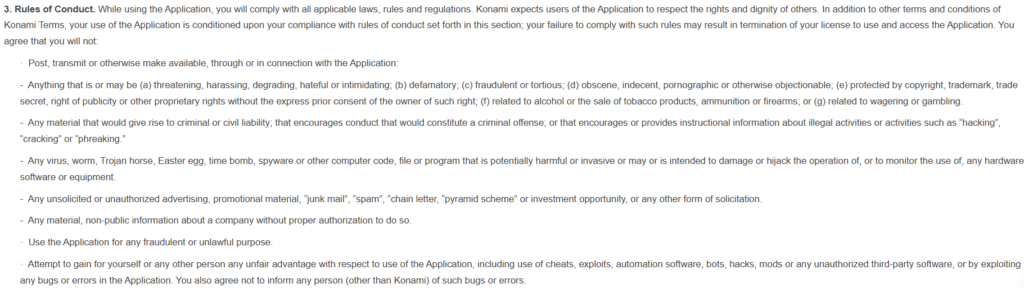 KONAMIの利用規約(3.Rules of Conduct)には、「チート、ボット、ハック、MODなどの未認可ソフトウェアを使用してはならない」と明確に規定されています。
