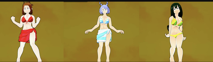 『ヒロアカUR』に登場する蛙吹梅雨、麗日お茶子、波動ねじれの3体のキャラクターに対して、ビキニスタイルのコスチュームを追加するカスタマイズMODとなります。