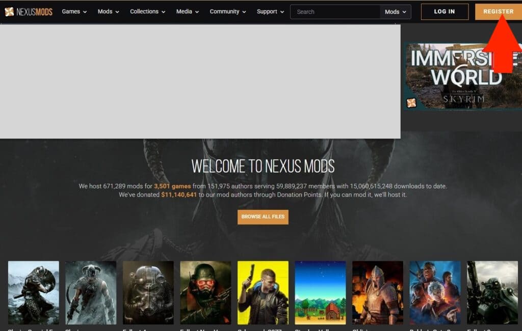 Nexus Modsの公式サイトにアクセスし、右上に表示されている「REGISTER」ボタンをクリックします。