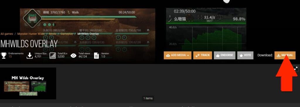 アカウント登録完了後、導入したいMODのページを開き、「MANUAL」というオレンジ色のボタンをクリックします。