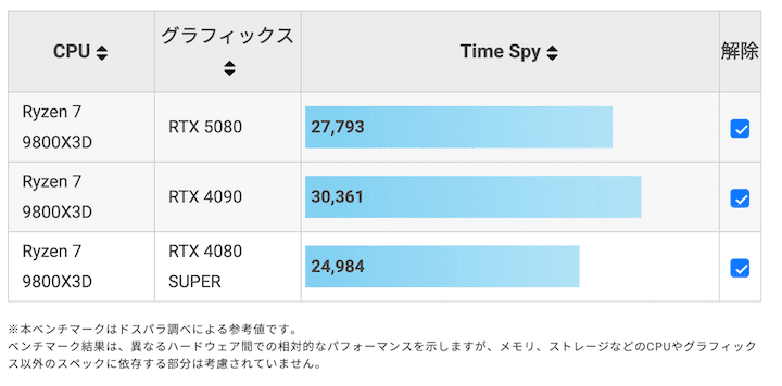 RTX40シリーズでの実測データを基に予測すると、RTX5080は上記のようなパフォーマンスを発揮できると見込まれます。
