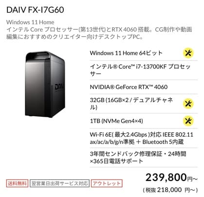 マウスコンピューターのアウトレット製品には、通常製品と同様の3年間無償保証および24時間365日のサポート体制が適用されます。