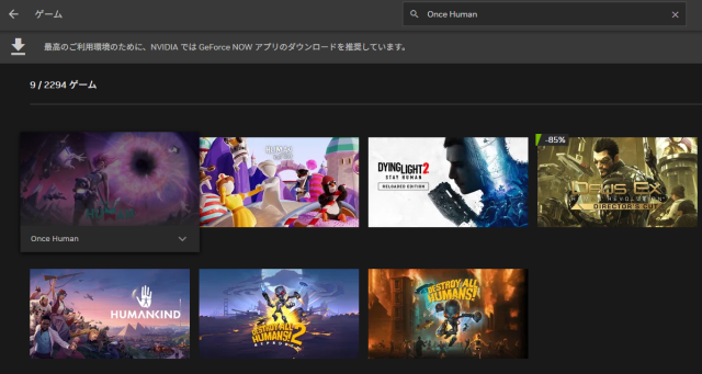 GeForce Nowアカウントでログイン後、『Once Human』と検索すると、該当するゲームタイトルが表示されます。