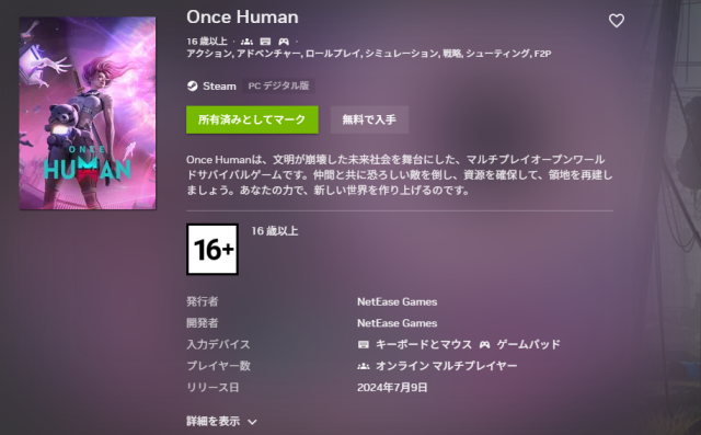 検索結果に表示された『Once Human』を選択し、「所有済みとしてマーク」をクリックします。