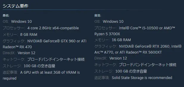 上記に示されている公式推奨スペックは一般的なビジネスPCでは満たすことが難しく、専用のゲーミングPCを必要とするレベルです。そ