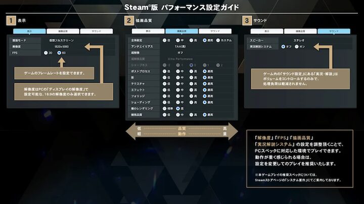 『プロスピ2024』のSteam版では、ゲーム内に画質調整メニューは存在しませんが、Steamクライアントを通じて設定変更が可能です。