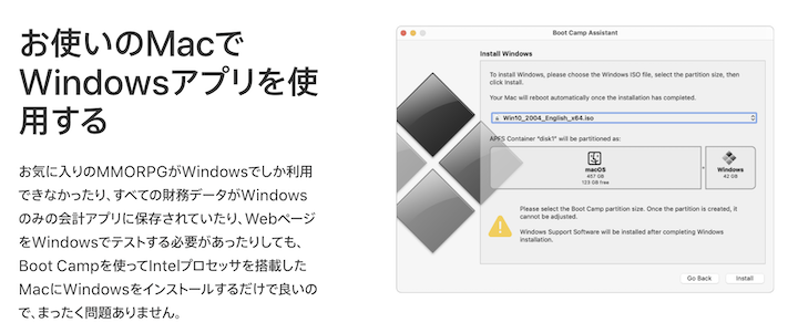 - Boot Campアシスタントを起動してインストールする(「/アプリケーション/ユーティリティ/」フォルダから起動できます)