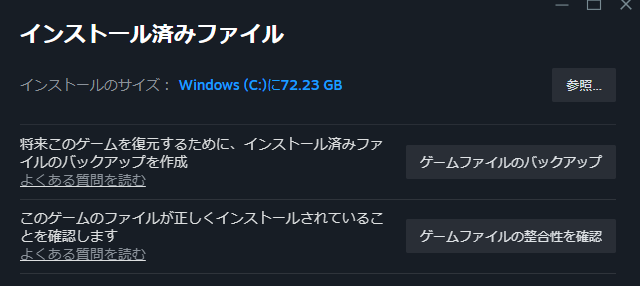 右側の「インストール済みファイル」タブを選択後、「ゲームファイルの整合性を確認」ボタンをクリックします。