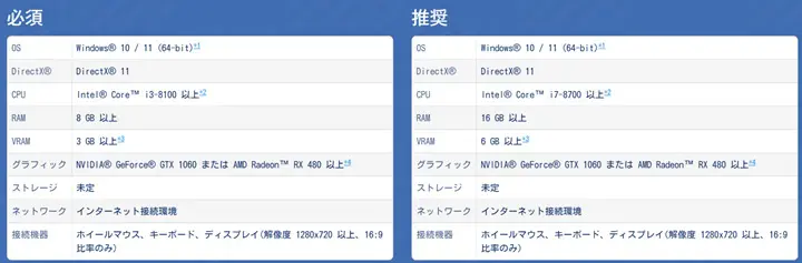 - GPU: NVIDIA GeForce GTX 1060 または AMD Radeon RX 480