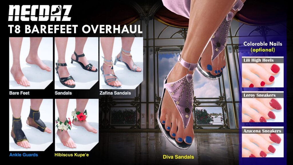足の形状やテクスチャマッピングをよりリアリスティックかつ高精細に変更し、裸足やサンダル系衣装着用時の視覚的品質を向上させます。