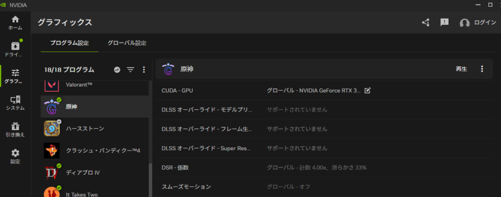 NVIDIA Appに搭載されている「グラフィックス」の設定項目から、スムーズモーション機能を有効化することで、ウマ娘を60fpsの環境下で快適にプレイすることが可能です。