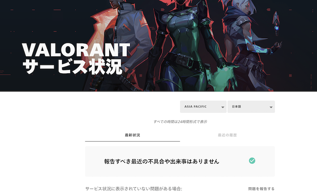 このような場合は、VALORANT公式のトラブル情報確認ページを確認すると、現在発生中や最近発生したトラブル情報を把握することができます。