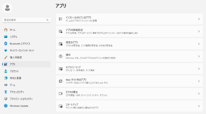 最初に、Windowsの設定画面からアプリケーション管理を開きます。
