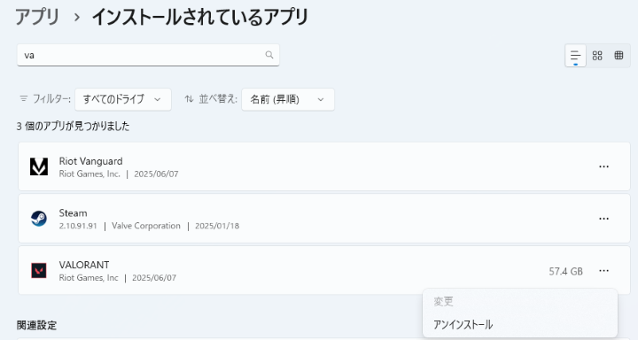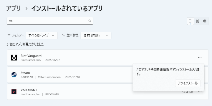 「インストール済みアプリ」の検索ボックスで「va」などと入力すると、『VALORANT』関連のアプリケーションが表示されます。