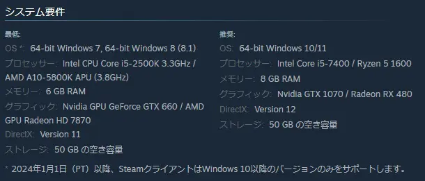 2024年のアップデートで改訂された推奨スペックですが、現代のゲームとしては控えめな要件となっています。